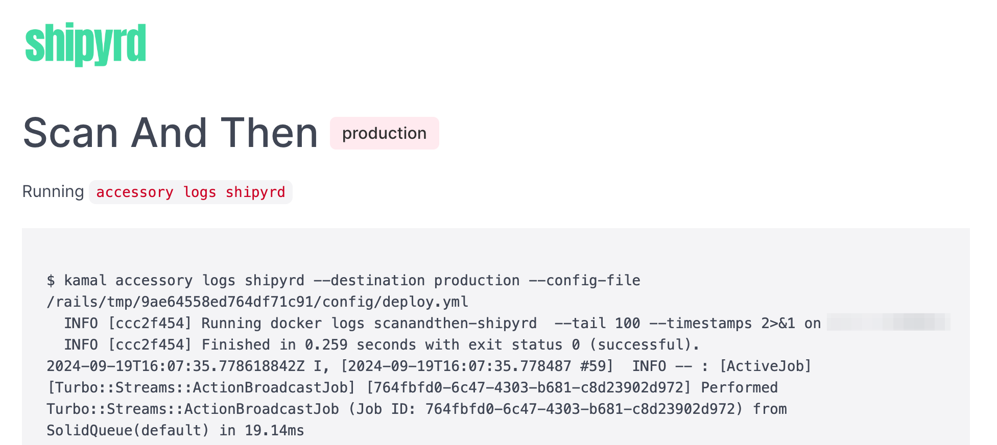 Yay! We can even inspect our own logs via the runner with accessory logs shipyrd