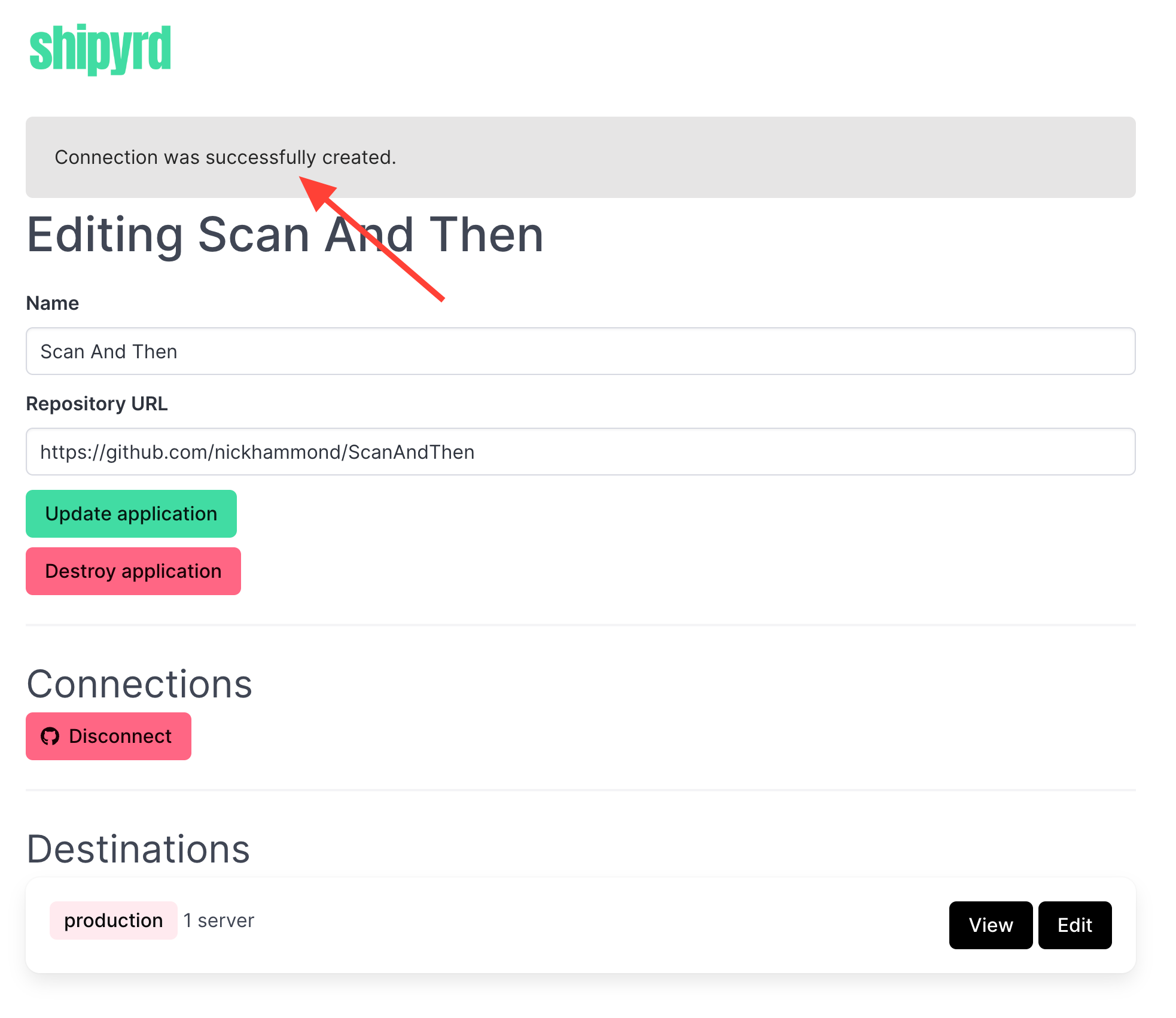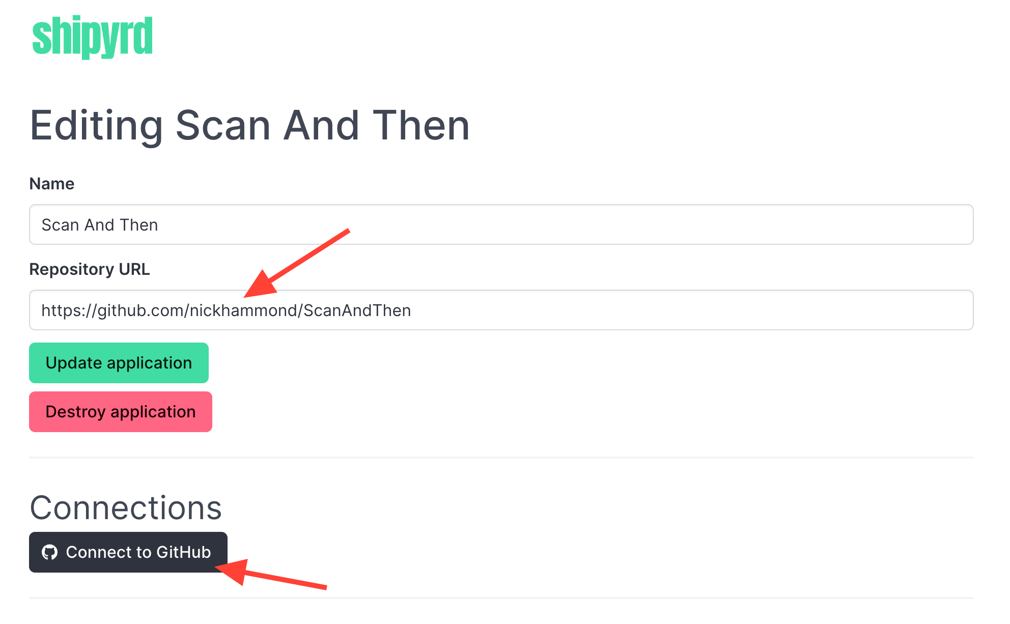 Once you’ve booted shipyrd and pinged it from your app you’ll see your application within Shipyrd(Scan And Then is a demo app I'm using for this blog post). Clicking the application name then takes you to the application edit page. If you haven’t already you’ll want to populate your repository URL so that Shipyrd knows where to fetch the deploy recipe from. From there you can click “Connect to GitHub”.