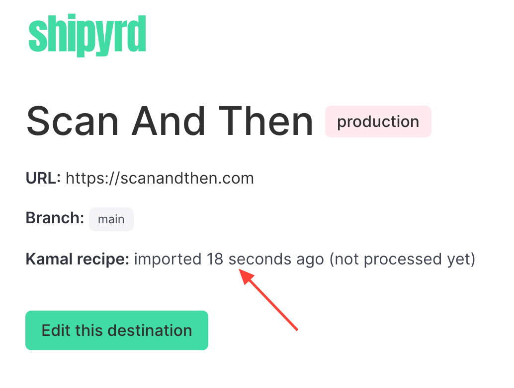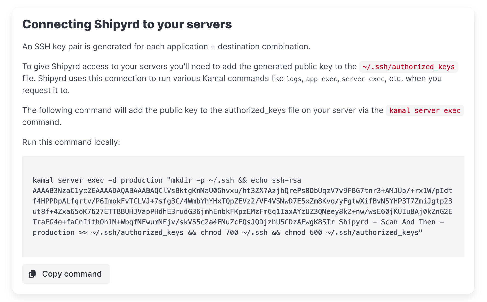 From here you’ll notice that your Kamal recipe has been imported along with some additional instructions to grant SSH access to Shipyrd for your servers. Shipyrd generates an SSH key pair for each destination within Shipyrd, the command outlined pushes the public key from that pair up to your destination servers.