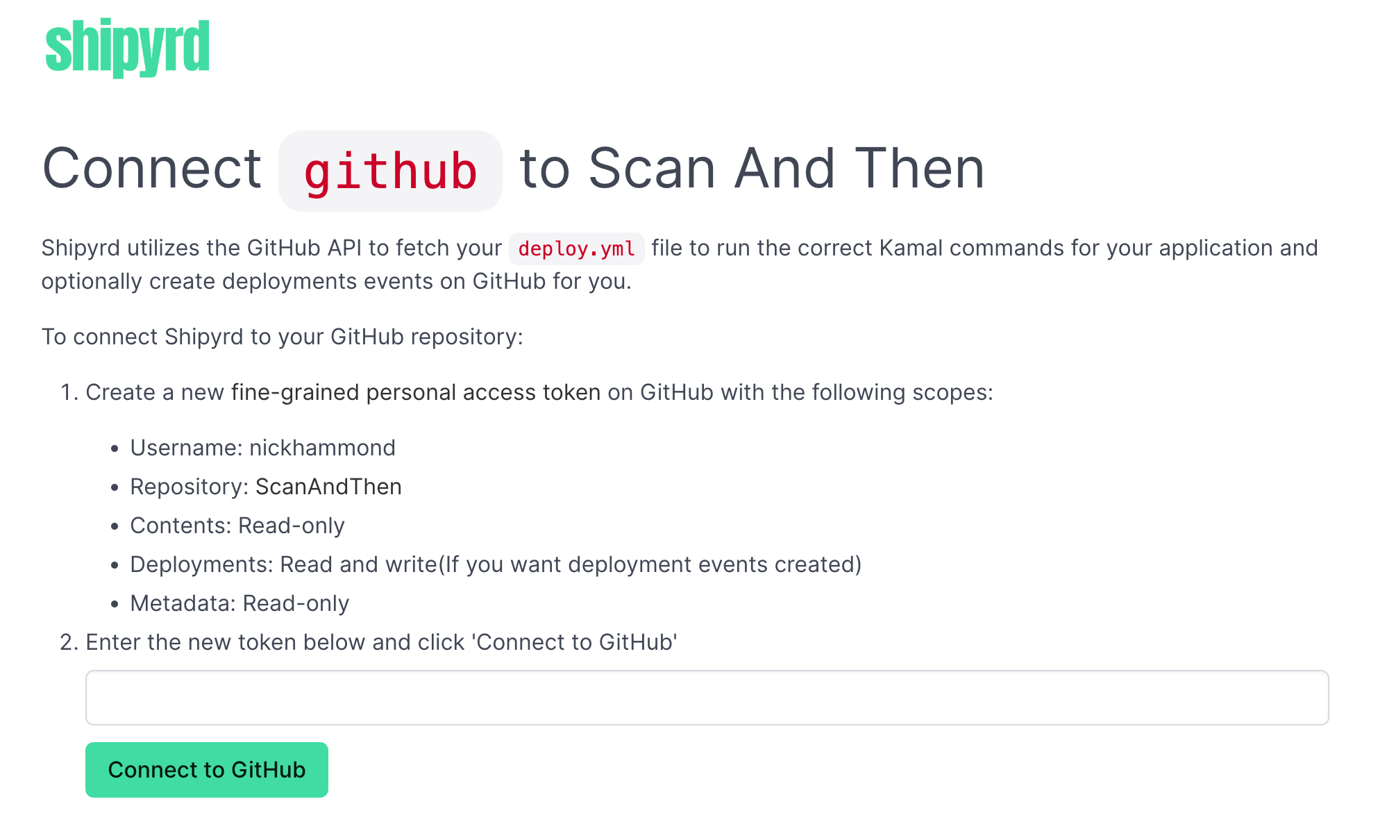Once you’re on the “Connect to GitHub” page you’ll see an overview of how to create the access token for Shipyrd. Shipyrd utilizes the content permission to fetch config/deploy.yml(and any matching destination deploy.yml files) which it subsequently uses whenever you run a command in Shipyrd. In the future there’s also plans to create deployment records in GitHub via Shipyrd which is where the deployment permission comes from.